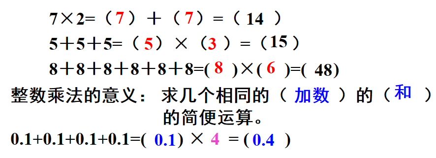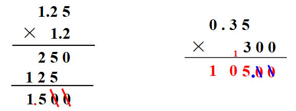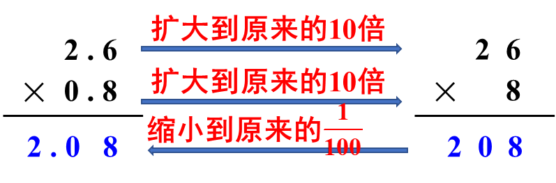小数乘法的计算方法:计算小数乘法时,先按照整数乘法的计算方法进行计算,再看乘数一共有几位小数,就从积的右边起向左数出几位点上小数点,积的位数不够时,用“0”补位。