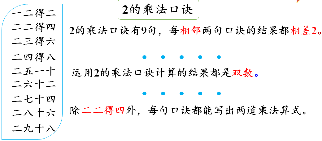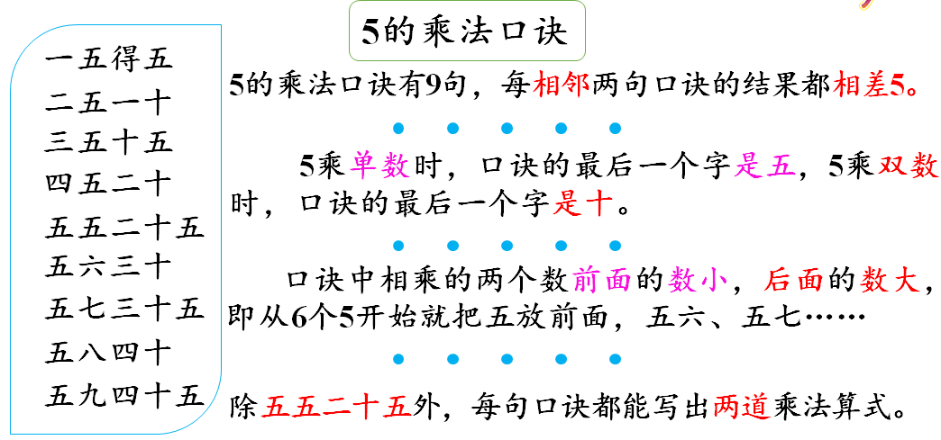 (3)2~5的乘法口诀各有9句,几的乘法口诀,每相邻两句之间就相差几。计算时,乘数是几,就用几的乘法口诀计算。
