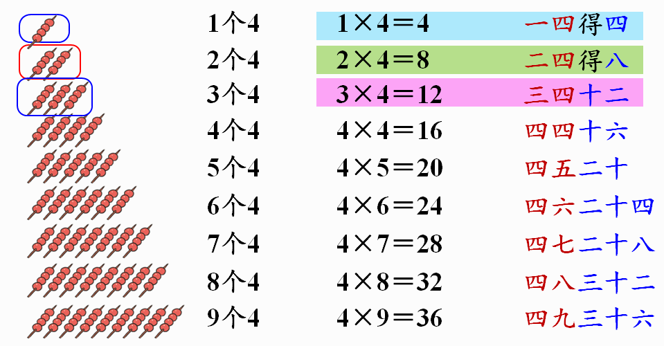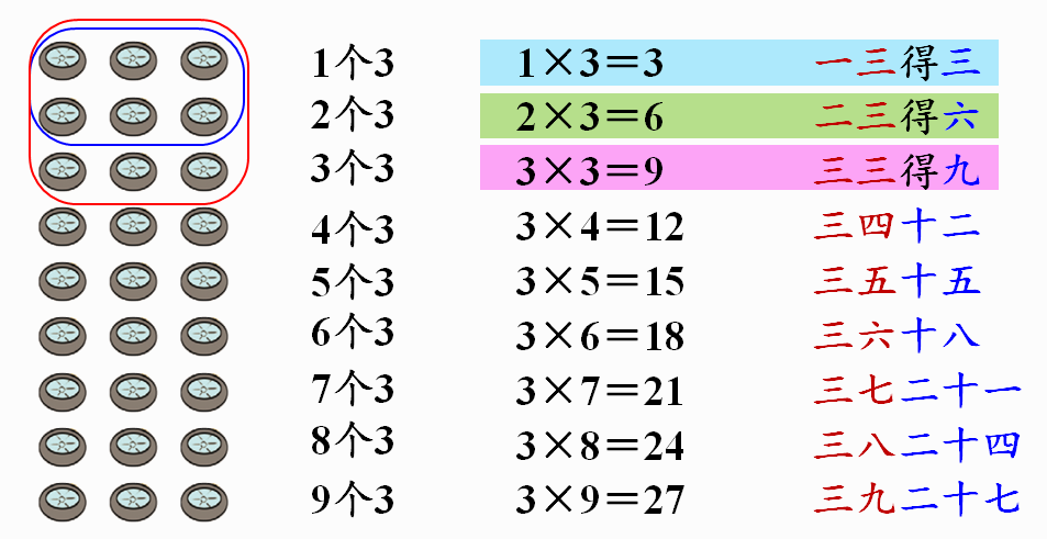 (2)解决实际问题时,只要是求几个几相加的和是多少,都可以用乘法来计算,列出算式后想对应的乘法口诀求出积。